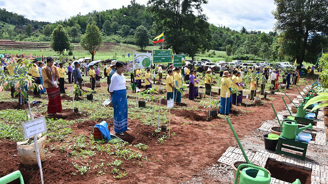 Also in 2006, another key project by LJM's GFLP materialized as the echo farm at Naung Mon in Lashio in the northern part of the Shan State of Myanmar began actual planting. Its lofty ideal has always been to create a mechanism and an eco-system that provides work opportunities to local farmers without the pressure of competition. As an eco-farm, work started with the improvement of the soil. Organic compost and liquid enzyme fertilizer were produced from leguminous greens and microbial colonies to best suit that purpose. The LJM eco-farm at Naung Mon places great value on practicality, humanity, and self-reliance. Its management refrains from willful depletion of natural resources and focuses on growing high-yield crops while giving priority to conservation to safeguard sustainability. Local farmers, therefore, learn skill sets fit for organic farming to produce the essence of oil from vetiver and lemongrass, as well as from sachi inchi (Plukenetia volubilis). Fair trade has become the farmers’ best friend for protection against multi-layered exploitation. LJM considers such practices to be the best possible demonstration of environmental friendliness.