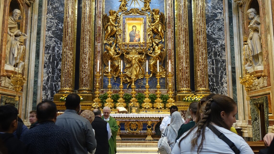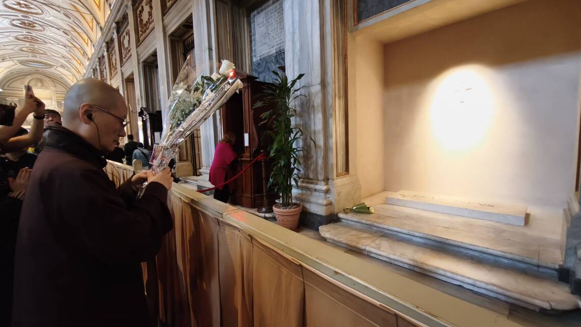 行程中,代表團特別前往聖母大教堂,向已故教宗方濟各致意。由顯月法師代表心道法師暨團隊獻上白玫瑰,表達深切的懷念與敬意。